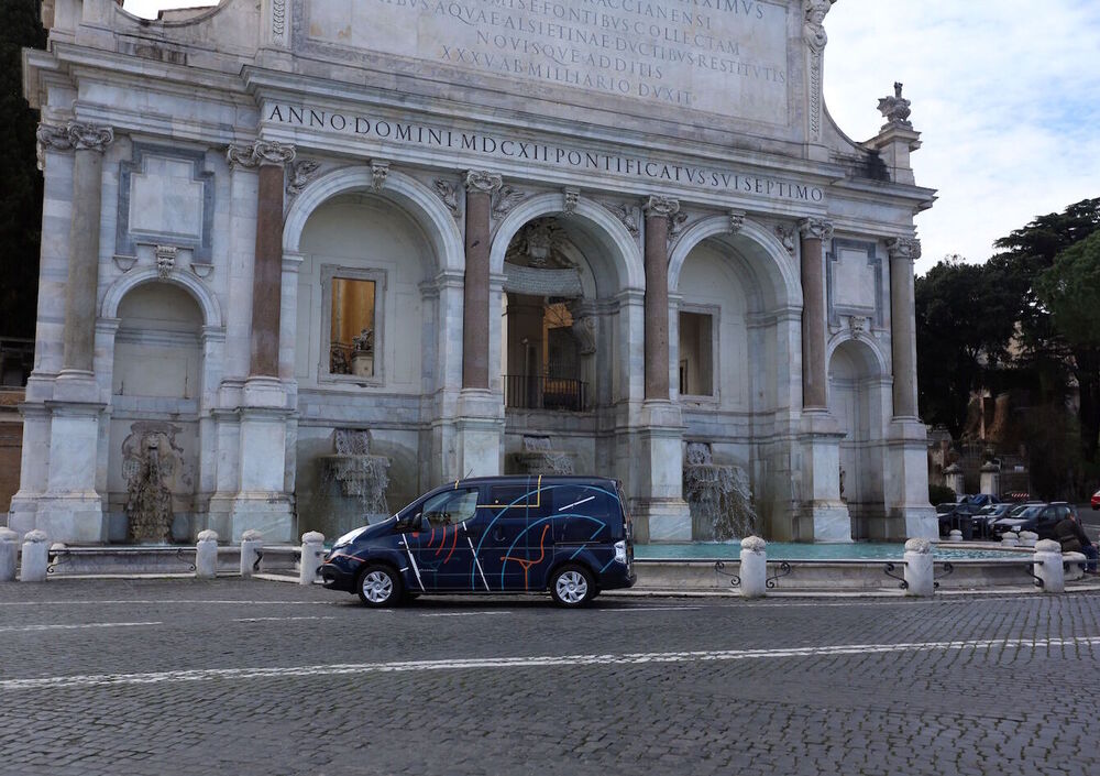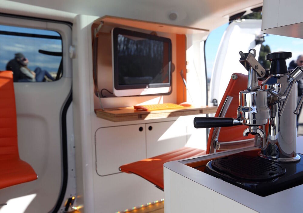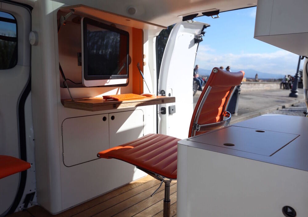 Nel compatto spazio disponibile non solo hanno trovato posto una scrivania ribaltabile integrata, il computer con touch-screen, l’accesso wireless a Internet, luci led azionate via smartphone, il sistema di ricarica del telefono wireless ed un efficiente impianto audio Bluetooth, ma anche accessori per migliorare la vita a bordo, grazie al mini frigo ed alla macchina Pavoni per farsi un espresso come si fosse al bar; e, all’occorrenza, basta sganciare dalla portiera di sinistra la bici pieghevole Brompton per raggiungere in un attimo un cliente o un amico per mangiare un boccone insieme.