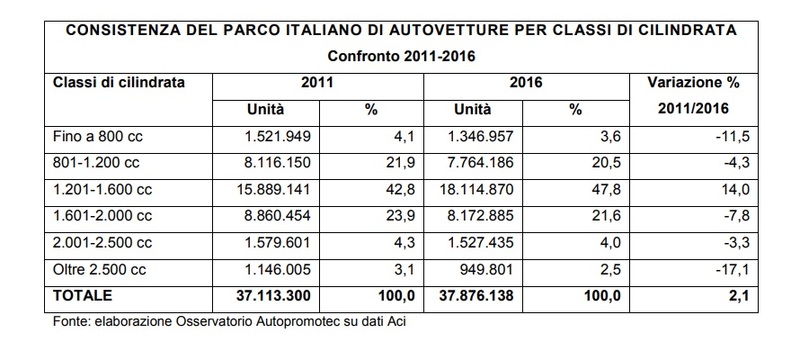 Nello specifico, le 1.2-1.6 litri oggi rappresentano con il 47,8% la metà del parco circolante, mentre nel 2011 erano il 42,8%. In termini di unità, tra il 2011 e il 2016 il numero delle autovetture circolanti con motore di media cilindrata è balzato in avanti da 15.889.141 a 18.114.870 unità, un incremento del 14%.