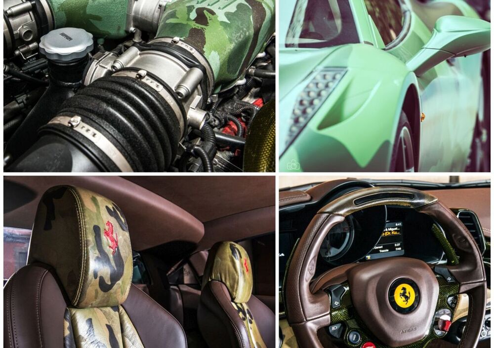 La Ferrari 458 ormai “ex Lapo Elkann” è caratterizzata da una livrea camouflage verniciata a mano utilizzando tre differenti gradazioni di verde e una di marrone. Lo stesso pattern militare è ripreso anche sulla cover del motore e sulle pinze freno. Completa la personalizzazione degli esterni il simbolo della pace in acciaio verniciato che ha sostituito il cavallino rampante sulle fiancate.