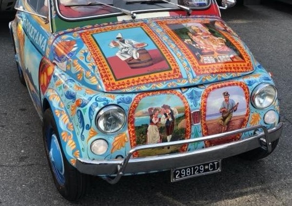 Per farlo il signor Farruggio ha scelto di decorare una Fiat 500 classica, altra icona italiana, con fregi e riproduzioni di San Gennaro, Totò, Sofia Loren, Pulcinella, il Maschio Angioino e dell’immancabile Diego Armando Maradona eseguite a mano dall’artista siciliano Roberto Caputo, specialista dei tipici “carretti” siciliani.