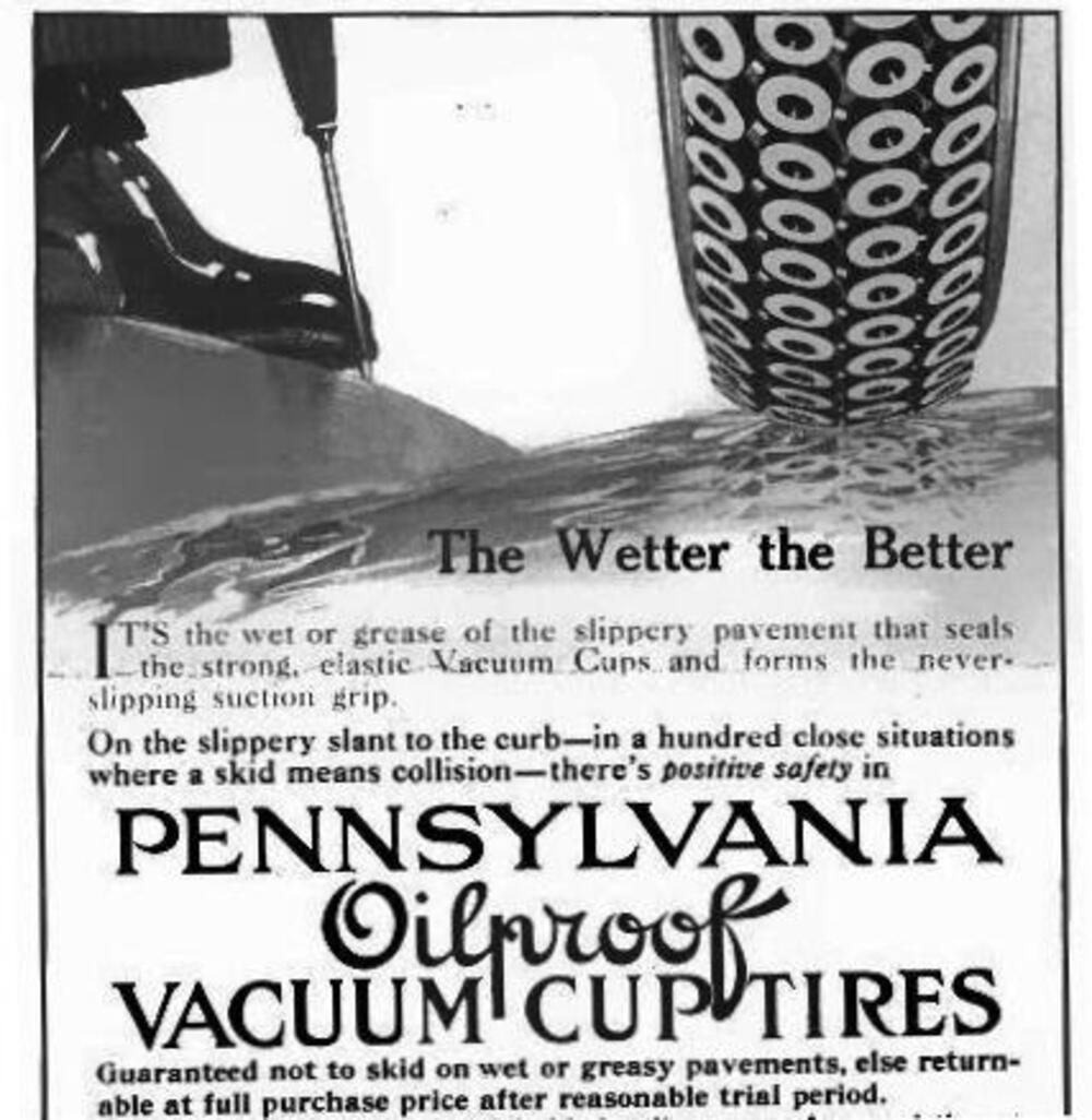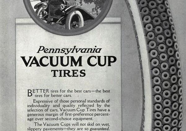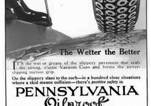 Quelli in foto sono disegni e slogan delle Vacuum Cup Tires by Pennsylvania Rubber Works. L’aziendina sorta a fine Ottocento, si proietta nel mondo auto e per il nuovo secolo (1900) sforna gomme e slogan degni di competere con alcuni, non tutti, dei grandi come la nostra Pirelli. Cosa ne direste voi, di un gommista che vende pneumatici auto dicendo “The wetter the better”. Questo è uno degli slogan usati al tempo, insieme a quello sul “suono della sicurezza”.