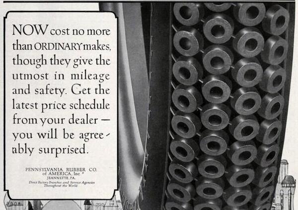 E poi: soddisfatti o rimborsati a prezzo pieno dopo un breve periodo di prova. Questo ci fa comprendere come a distanza di oltre cento anni, i gommisti debbano per nascita sempre lottare, a suon di campagne commerciali verso gli automobilisti. Con giusto una quindicina di rivenditori sparsi nelle sole grandi città degli USA, la PRC (quella targata PA, non cinese) doveva lottare a suon di promo per accaparrarsi clienti. Non essendo ancora nata la F1 e non avendo ancora Nuvolari acceso il suo mito a livello globale, non potevano fregiarsi di testimonial piloti, ma di certo quella tenuta data per garantita... Faceva sognare traiettorie da mago del bagnato come Ayrton Senna.