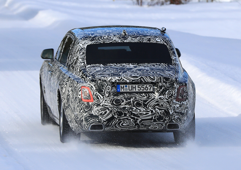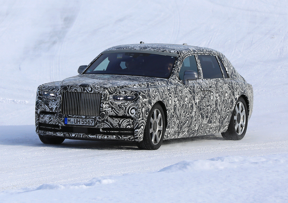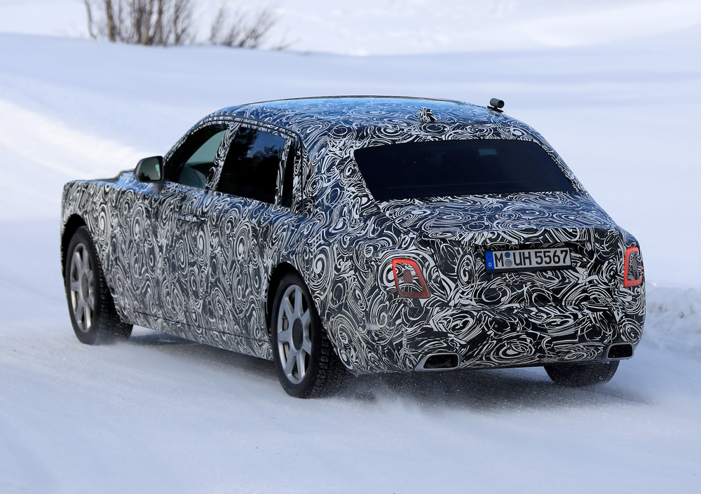 La nuova Rolls-Royce, che non è certo si debba chiamare ancora Phantom come il modello “vecchio” di oltre 12 anni che si appresta a sostituire, mostra ora parte delle proprie forme, di taglio abbastanza netto e solido soprattutto anteriormente, delle superfici vetrate e dei gruppi ottici, verosimilmente ancora rettangolari frontalmente. In evidenza anche una griglia frontale relativamente cresciuta in altezza e i due scarichi posteriori, veri.