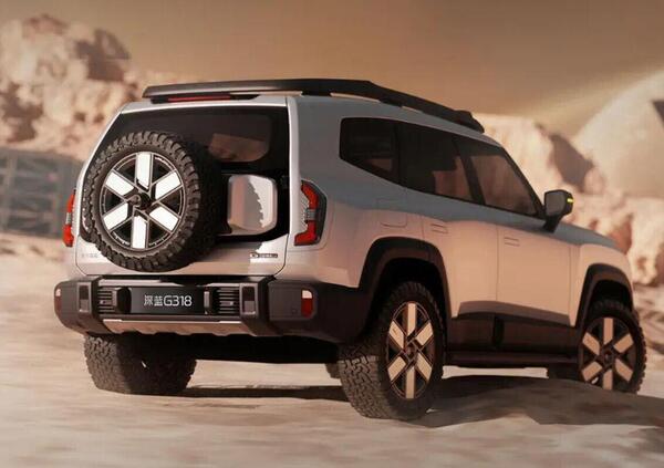 Nella parte posteriore, invece, è presente l’iconico pneumatico di scorta e, osservando con cura il portellone, sembra che la Deepal G318 adotterà un’apertura laterale.