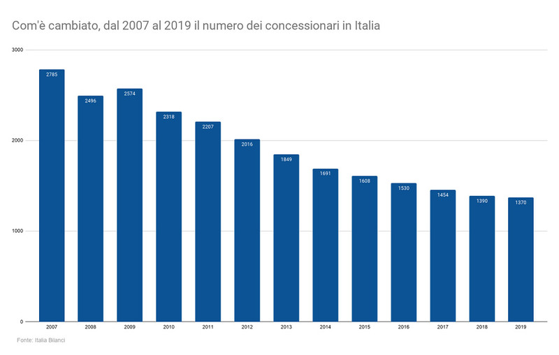 Nel 2007, alla vigilia del drammatico fallimento di Lehman Brother, i concessionari in Italia erano 2.785. Dopo il passaggio di quell'uragano finanziario tale cifra è stata dimezzata, arrivando a 1.390 unità.