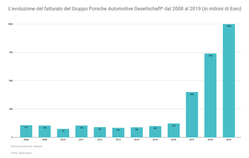 Non è da meno il gruppo Porsche Automotive, che fa capo all’austriaca Porsche Holding di Salisburgo, che nel 2008 fatturava 108 milioni di euro e nel 2018 ha raggiunto 740 milioni e cresce ancora perché si stima che nel 2019 supererà il miliardo.