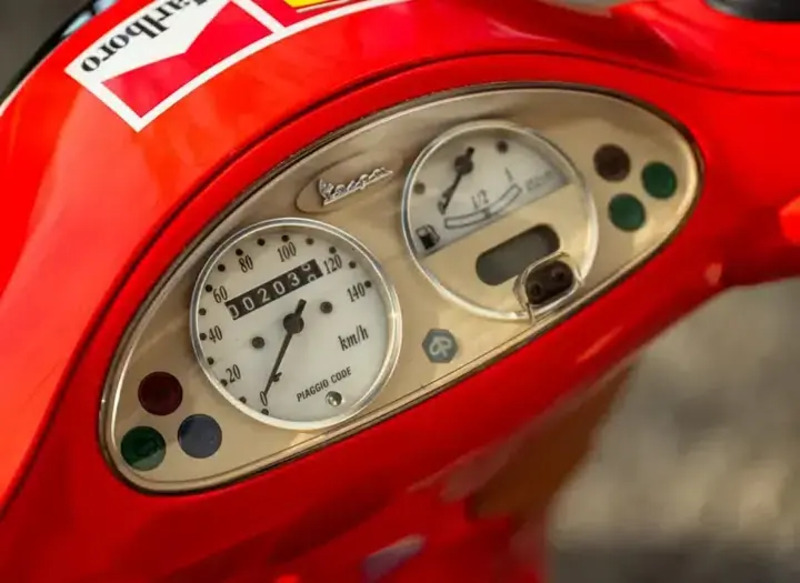 Personalizzata con la livrea rosso Ferrari e dettagli esclusivi, la Vespa celebrava il ritorno al titolo mondiale della Ferrari nel 2000 e l’inizio del ciclo dominante guidato da Michael Schumacher insieme a Jean Todt e Ross Brawn. Ogni scooter riportava finiture dedicate e materiali di qualità superiore rispetto agli esemplari di serie, trasformando un mezzo urbano per eccellenza in un oggetto profondamente legato alla Formula 1. Oggi questi scooter sono considerati veri memorabilia ufficiali della squadra di Maranello, rarissimi sul mercato internazionale.