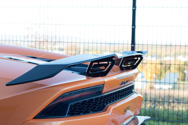 Nella parte inferiore del paraurti trova posto un nuovo diffusore, sempre in carbonio, dentro il quale alloggiano i quattro scarichi del sistema Akrapovic in titanio, che ha permesso un risparmio di peso di 20 Kg rispetto all'originale. Allo stesso tempo lo scarico in titanio ha assicurato un incremento di potenza di circa 20 CV e 22 Nm di coppia. Il mostruoso V10 aspirato di Sant'Agata Bolognese arriva quindi a 630 CV e 582 Nm di coppia.