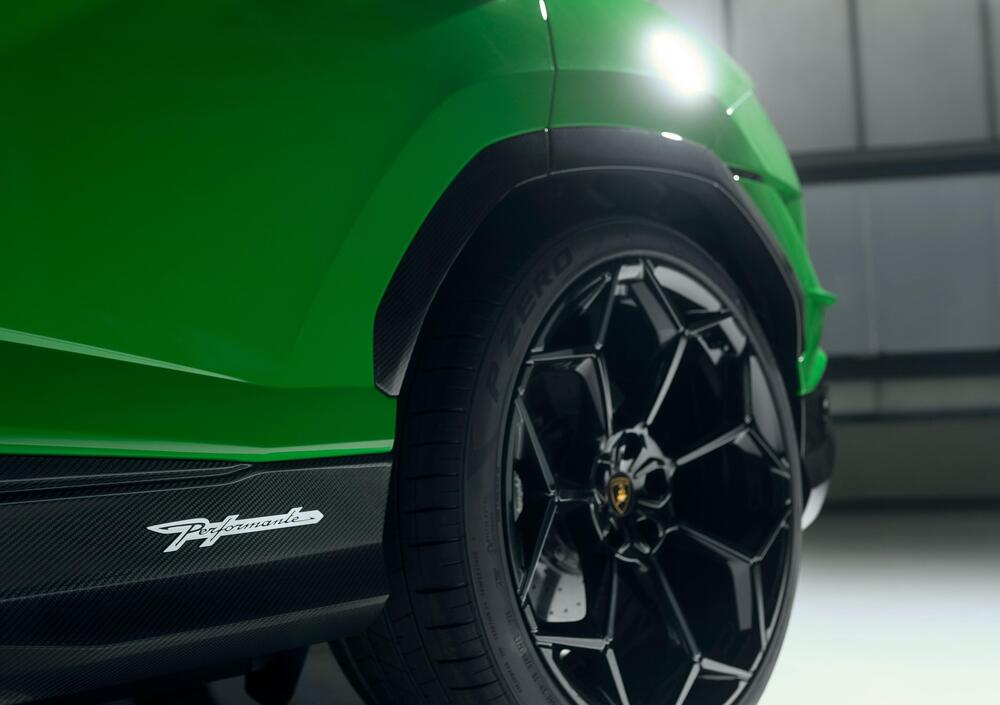 La Lamborghini Urus Performante è anche più bassa di 20 mm rispetto a prima, con una differenza di sostanza nel comparto sospensivo: l'elemento di controllo elettronico rimane ma le molle elicoidali prendono il posto di quelle ad aria, per una resa di assetto ancora più ferma e aggressiva. Stesso discorso per l'allargamento della carreggiata di 16 mm, accompagnata da nuovi passaruota e la ruote da 22 o 23 pollicii calzate Pirelli PZero. I nuovi paraurti allungano la vettura di 25 mm (ora 5,137 metri) e questa nuova proporzione fra altezza e lunghezza visivamente colpisce molto. Altrettanto peculiare è la nuova coda con estrattore di carbonio da cui spuntano i quattro possenti tubi dello scarico Akrapovic di titanio.