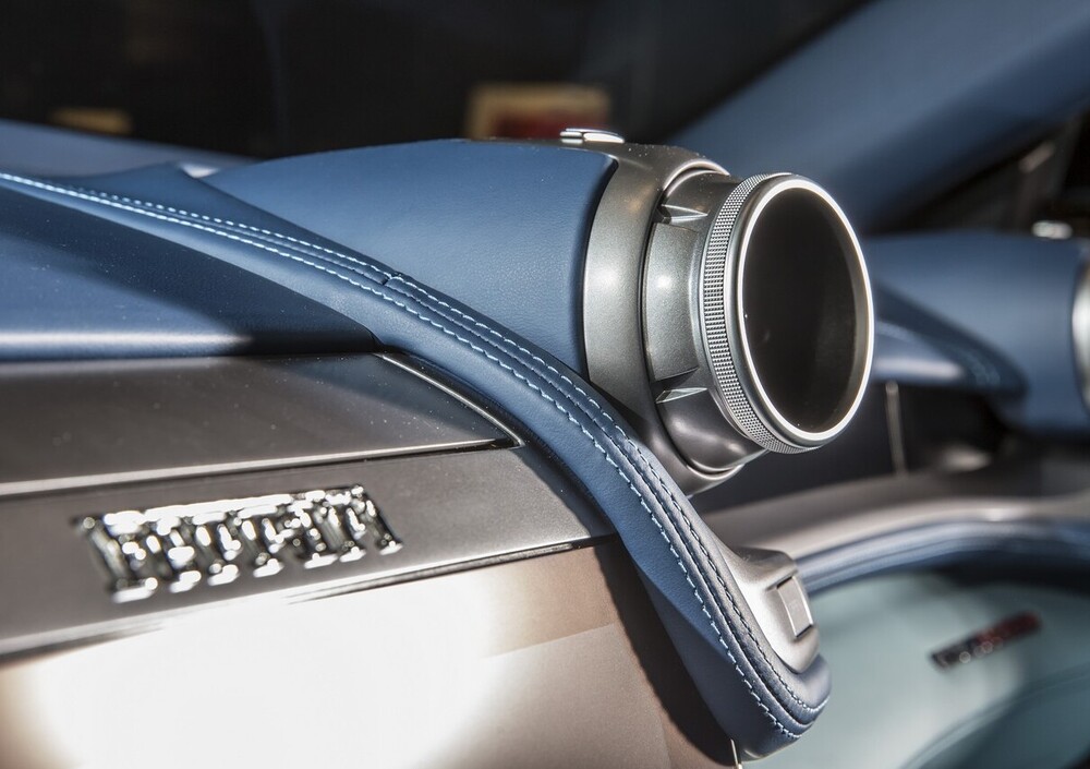 I sedili sono stati personalizzati con una pelle intrecciata a mano con inserti in Solaro di Scabal, realizzata per Garage Italia dagli artigiani di Foglizzo Leather che a breve daranno vita a una collezione che porterà il nome dell’hub creativo: al suo interno ci saranno diverse tipologie di intrecciati con materiali come pelle, Alcantara® e tessuti derivati dal mondo della moda.