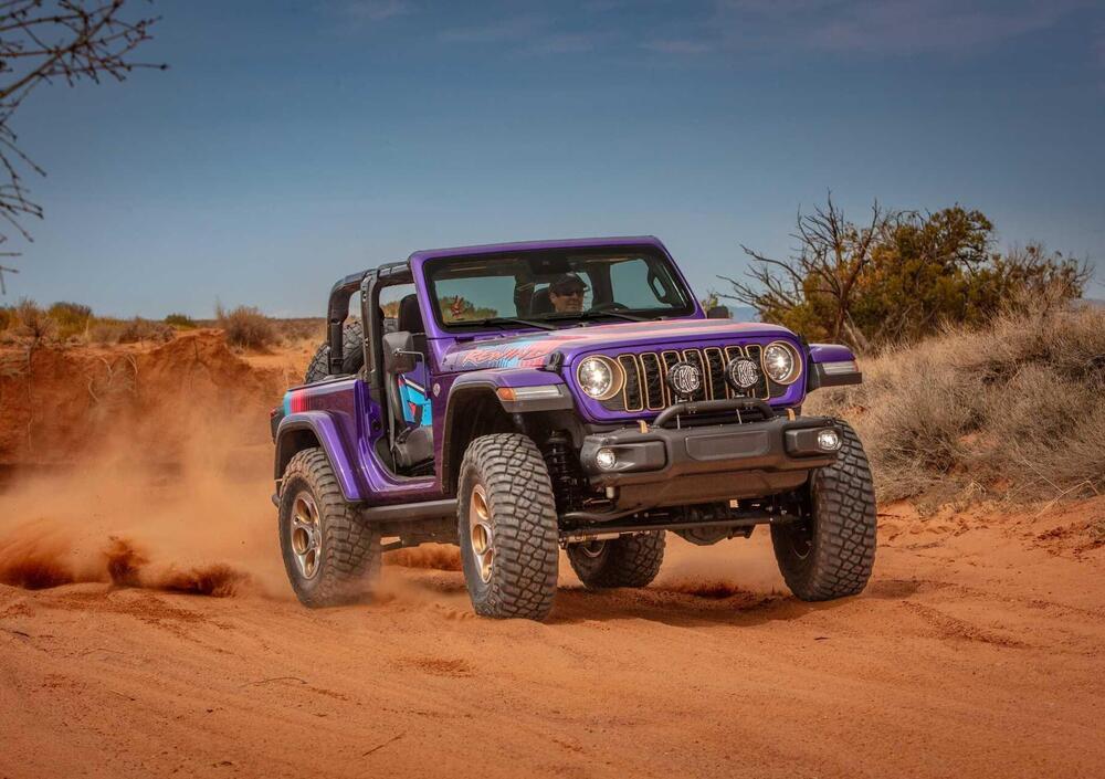 - Jeep Rewind: Un salto negli anni ‘80 e ‘90 con colori sgargianti: basata su una Wrangler Rubicon 2025 2.0 turbo, questa concept propone una vernice viola “Grimace”, grafiche personalizzate, tettuccio mesh, ruote AEV da 17” con dettagli oro, e un telefono cellulare vintage come tocco finale retrò.
