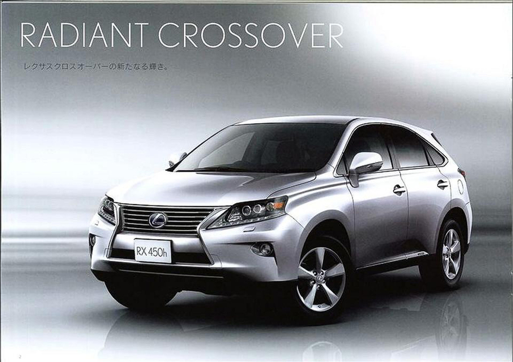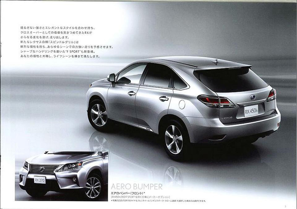E' apparsa in rete una scansione della brochure ufficiale del restyling della Lexus RX, che presenta ora un design esterno fortemente caratterizzato dal nuovo linguaggio stilistico che il brand di lusso del marchio Toyota ha recentemente portato al debutto sulla GS.
