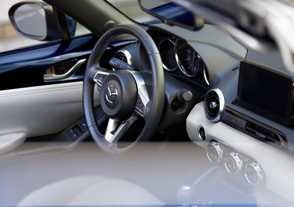 Chi volesse acquistare la Mazda MX-5 MY2021 potrebbe scegliere tra sette tinte della carrozzeria, tra cui la novità Deep Crystal Blue Mica e la nuance Snowflake White Pearl, esclusiva per la 100th Anniversary. Si rinnovano pure gli interni, che di serie presentano sedili risacaldati in pelle nera o, opzionale, in pelle nappa Burgundy Red o Pure White. Ci sono novità anche per quanto riguarda il sistema di infotainment, che guadagna la compatibilità con Apple CarPlay wireless.