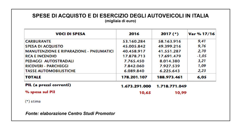 Da questa elaborazione originale emerge che nel 2017 la spesa del Paese per l’auto sarà di 189 miliardi, pari a circa l’11% del Pil. Il maggior esborso sarà per l’acquisto di carburanti (58,2 miliardi), mentre 49,4 miliardi saranno destinati all’acquisto di autoveicoli, 41,6 miliardi alla manutenzione, alla riparazione e ai pneumatici, 17,7 miliardi all’assicurazione, 8 miliardi ai pedaggi autostradali, 7,9 miliardi ai ricoveri e parcheggi e 6,2 miliardi alle tasse automobilistiche per un totale, che ammonta a 189 miliardi contro i 178 del 2016 (+6%).