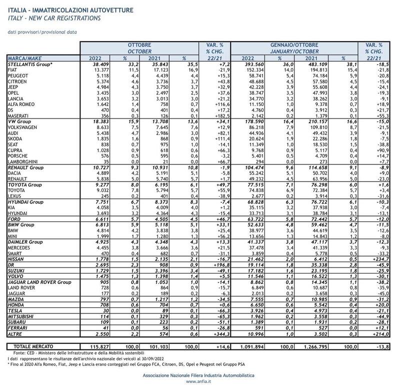 I dati diffusi dal CED del Ministero delle Infrastrutture e della Mobilità Sostenibili, riportano ad ottobre 115.827 immatricolazioni di autovetture, il +14,6% sul 2021; da inizio anno, il bilancio si attesta al -13,8%, con 1.091.894 vetture rispetto alle 1.266.795 unità del 2021, mentre il confronto con il 2019 è ben più pesante, arrivando al -32,8%.