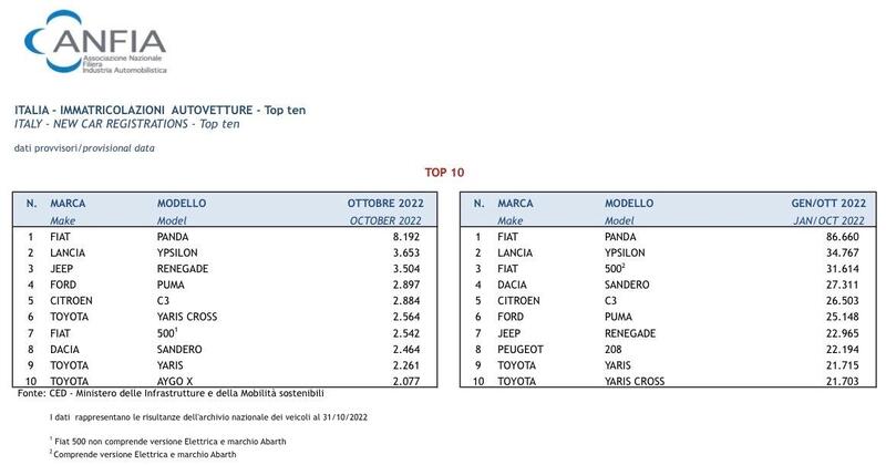 Metà della top ten di ottobre vede presenti modelli Stellantis e che monopolizzano il podio: domina come sempre Fiat Panda con 8.192 unità, seguita da Lancia Ypsilon con 3.653 pezzi e Jeep Renegade che arriva a 3.504); quinto posto per Citroen C3 (2.884), e settimo per Fiat 500 (2.542).