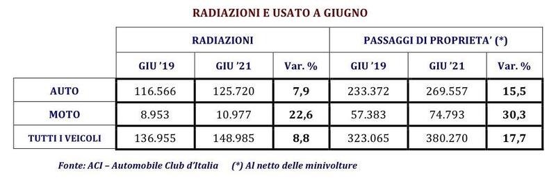Crescita a cifra doppia nel mese per il mercato dell'usato sia nel settore delle quattro ruote che in quello delle due ruote: i passaggi di proprietà delle vetture al netto delle minivolture (i trasferimenti temporanei a nome del concessionario in attesa della rivendita al cliente finale) hanno chiuso con un aumento del 15,5% su giugno 2019, il mese di riferimento più corretto per un confronto non penalizzato dalle conseguenze della pandemia.