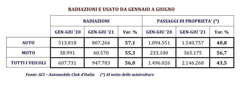 Nel primo semestre 2021 in confronto al 2020, le radiazioni hanno archiviato +57,1% per le vetture, +55,3% per i motocicli e +56% per tutti i veicoli.