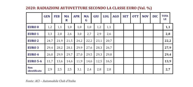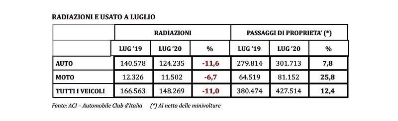 Nel periodo gennaio-luglio 2020, le radiazioni hanno messo a bilancio decrementi del 31,8% per le vetture, del 28,1% per le moto e del 31,4% per tutti i veicoli.