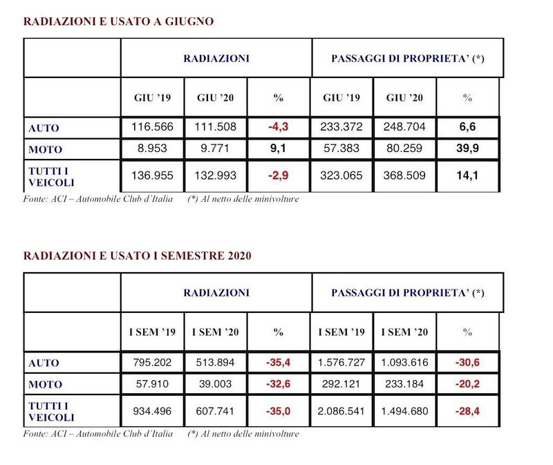 I dati consolidata del primo semestre 2020, ovviamente influenzati dal lungo periodo di lockdown, si chiudono con contrazioni del 30,6% per le vetture, del 20,2% per le due ruote e del 28,4% per tutti i veicoli.