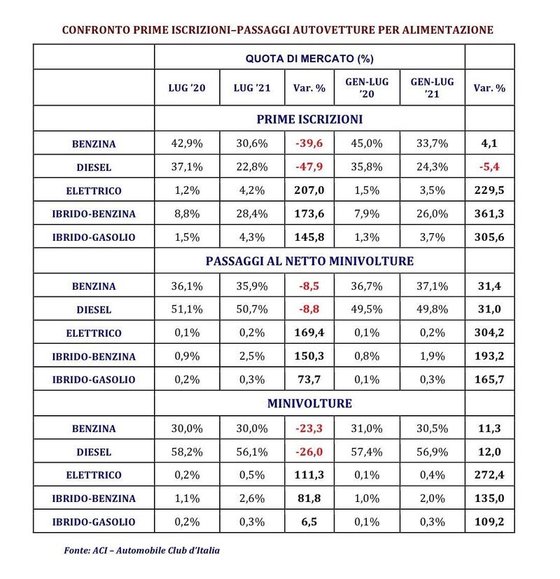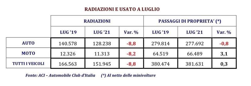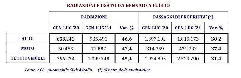 Nel periodo gennaio-luglio 2021 rispetto allo stesso periodo del 2020 si evidenziano per i trasferimenti di proprietà incrementi complessivi del 30,2% per le vetture, del 37,4% per i motocicli e del 31,4% per tutti i veicoli.
