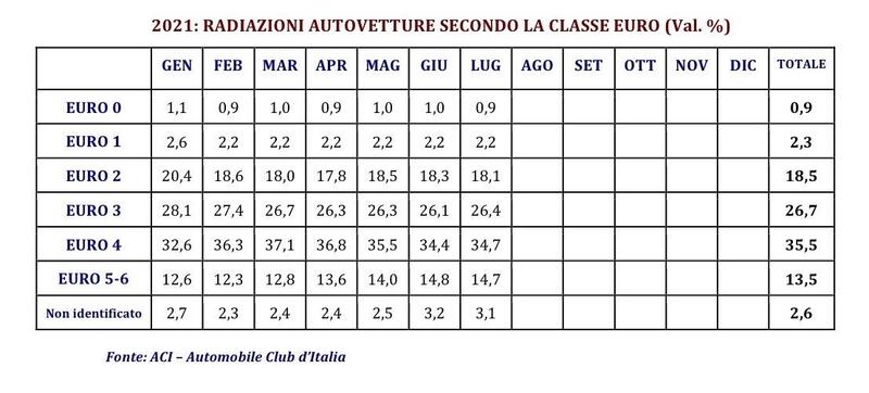 Bilancio in rosso per le radiazioni: per le quattro ruote, luglio si è chiuso con un calo dell’ 8,8% rispetto all’analogo mese 2019 (-4,6% la media giornaliera), per la forte riduzione delle radiazioni per esportazione (-28,9%), a fronte di un bilancio positivo dello 0,7% delle rottamazioni; il tasso unitario di sostituzione è del 1,06 nel mese (ogni 100 auto nuove ne sono state radiate 106) e a 0,91 nei primi sette mesi.
