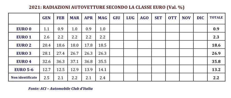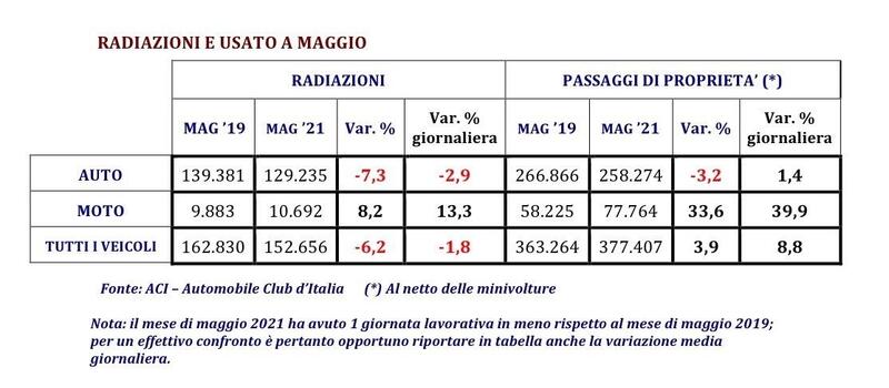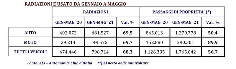 Nei primi cinque mesi del 2021, in confronto allo stesso periodo del 2020, le radiazioni registrano valore del +69,5% per le vetture, del +69,7% per i motocicli e del +68,3% per tutti i veicoli.