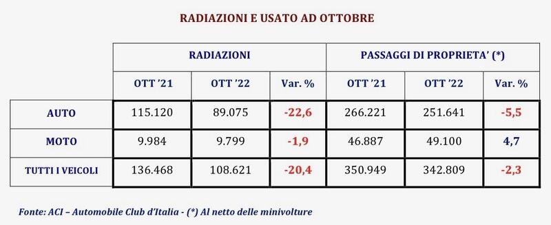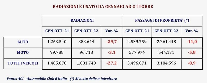 Dati delle radiazioni, infine, negativi per tutti i comparti nei primi dieci mesi del 2022 rispetto all 2021: -29,7% per le vetture, -3,1% per i motocicli e -27,2% per tutti i veicoli.
