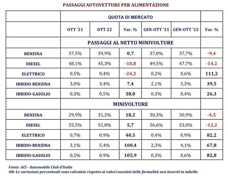 In cima alle dinamiche di compravendita per l'usato sono sempre le alimentazioni tradizionali (benzina e gasolio), mentre la quota delle ibride a benzina si attesta al 3,4%; nei minipassaggi si conferma il primato delle diesel (51,8% di quota ad ottobre, ma in calo su ottobre 2021, quando era il 55,5%), mentre l’incidenza di ibride a benzina che raggiunge il 5,4%; in ripresa ad ottobre i passaggi di proprietà dei motocicli, che al netto delle minivolture riportano un incremento del 4,7% sullo stesso mese del 2021.