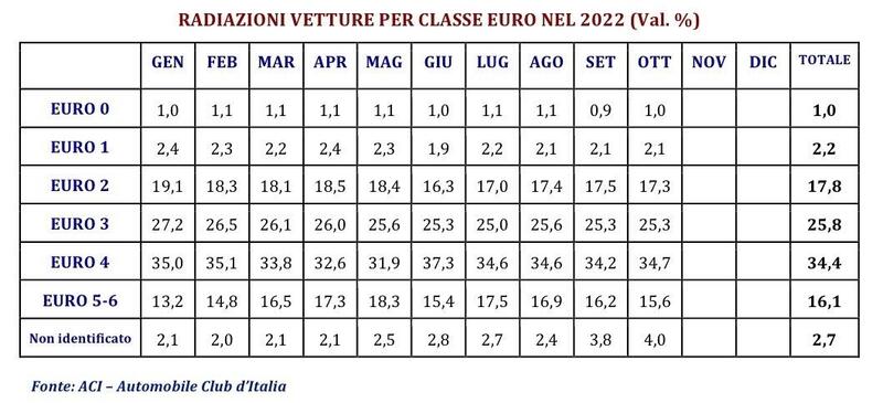 Non si interrompe ad ottobre la crescita del parco circolante italiano, a causa del dato negativo del 22,6,% derivante dalle radiazioni di auto, che significa un tasso unitario di sostituzione dello 0,73 nel mese (ogni 100 auto nuove ne sono state radiate 73) e di 0,81 nei primi dieci mesi 2022; in terreno negativo anche le radiazioni di motocicli, che ad ottobre consuntivano un -1,9% sull’analogo mese 2021.
