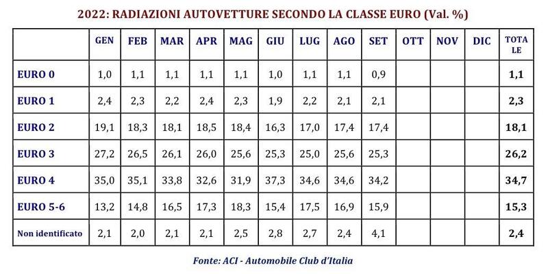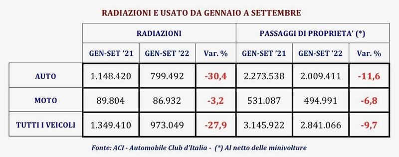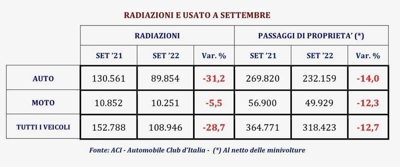 Da inizio 2022 rispetto al 2021 le radiazioni hanno riportano questi valori: -30,4% per le autovetture, -3,2% per i motocicli, -27,9% per tutti i veicoli.