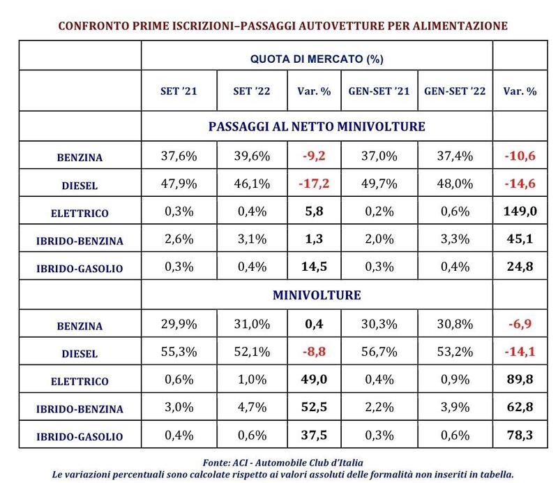Nei minipassaggi primeggiano incontrastate le vetture diesel (52,1% di quota a settembre 2022, pur in calo su settembre 2021, quando era il 55,3%), con un’incidenza delle auto ibride a benzina in crescita mensile del 4,7%.