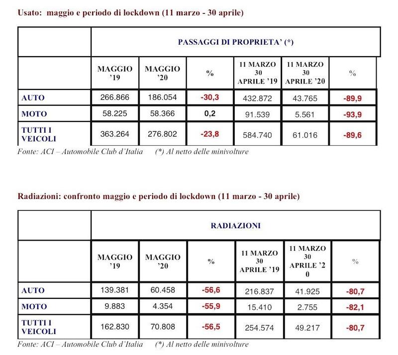 Il periodo gennaio-maggio 2020 registra per le radiazioni decrementi medi del 40,5% (in particolare -40,7% per le vetture e -40,3% per i motocicli).