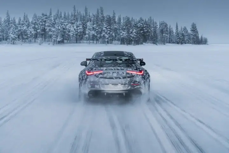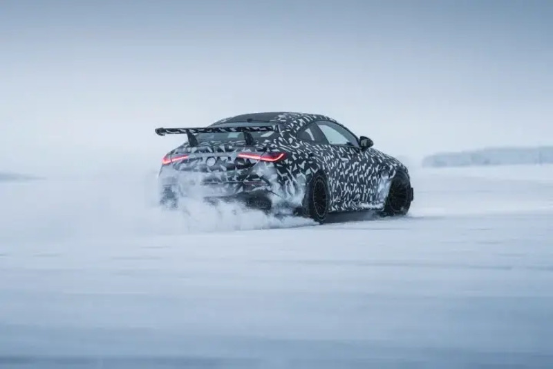 Le immagini diffuse dai test invernali rivelano un’impronta visiva molto più aggressiva rispetto alla CLE standard. La carrozzeria appare più larga, con passaruota allargati, un fronte ridisegnato con grandi prese d’aria, e soprattutto una ala posteriore fissa di grandi dimensioni che richiama l’estetica e la funzionalità delle moderne hyper-GT. I quattro terminali di scarico trapezoidali e l’assetto ribassato completano l’allure da vettura da pista stradale.