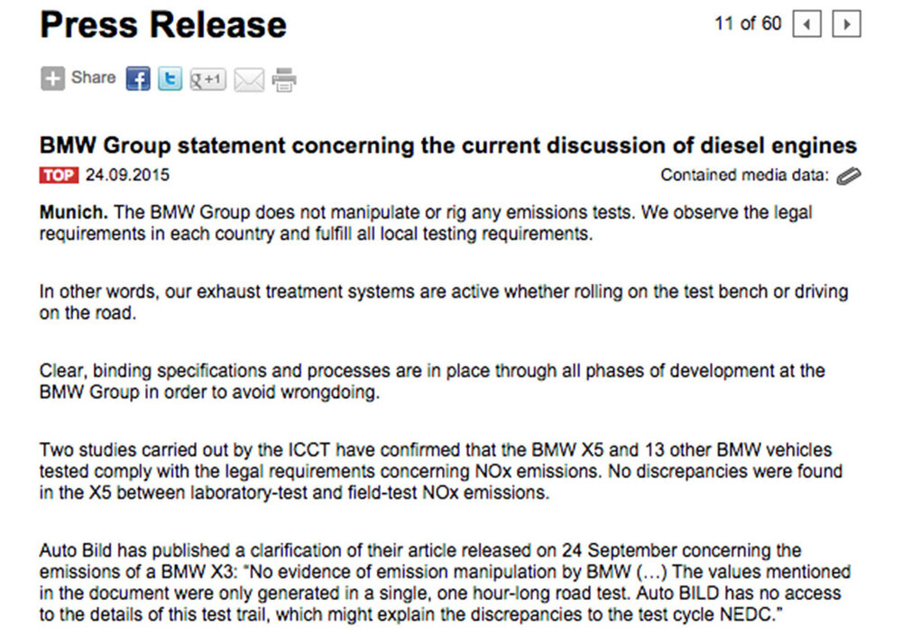 “L’ICCT [International Council on Clean Transportation, l’ente che ha fatto scoppiare il dieselgate VW, ndr] ha confermato che la BMW X5 e altri 13 modelli BMW sottoposti ai test sono risultati conformi alle leggi in merito alle emissioni degli NOx. Non sono state riscontrate discrepanze tra le X5 testate in laboratorio e quelle provate su strada in merito alle emissioni”.