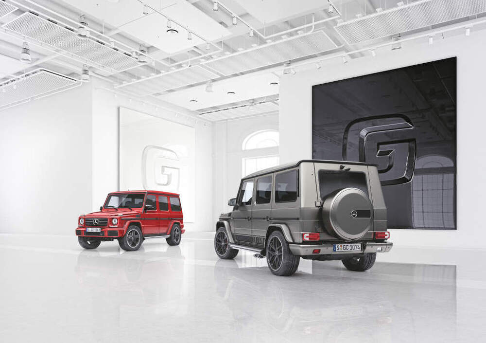 Le Classe G designo manufaktur Edition si distinguono per i numerosi elementi di colore nero applicati sugli esterni, come i cerchi in lega leggera AMG a 5 razze con pneumatici 275/55 R19, gli inserti sulla modanatura di protezione esterna laterale, le tre lamelle nella mascherina del radiatore, i retrovisori esterni e la copertura della ruota di scorta, tutti verniciati in nero ossidiana. Tre le vernici disponibili: rosso magma designo, Mystic white bright designo e nero ossidiana.
