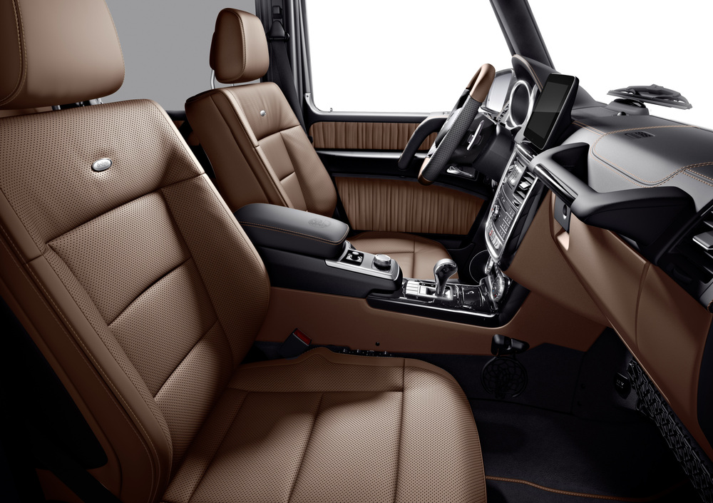 Negli interni la G 350 d Limited Edition accoglie i suoi passeggeri con rivestimenti dei sedili in pelle nappa marrone cuoio, mentre la plancia portastrumenti e il volante AMG Performance si presentano in versione bicolore marrone cuoio/nero con cuciture in marrone chiaro.