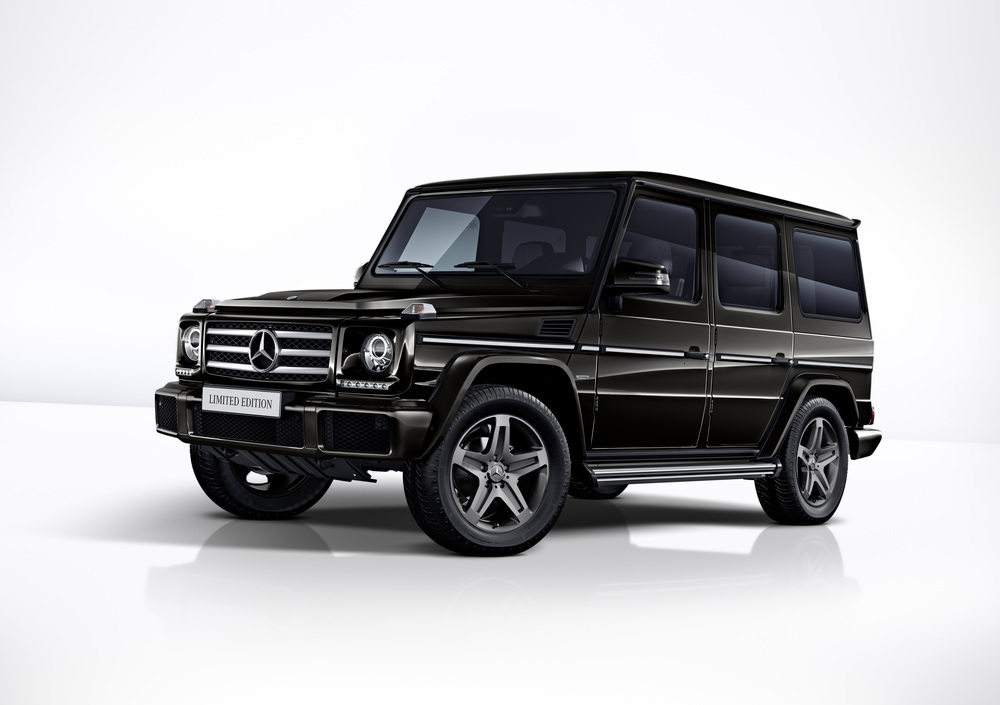 La Classe G 350 d Limited Edition si presenta in colore nero moka designo metallizzato con un listello di protezione impreziosito da un inserto decorativo in look alluminio spazzolato. Sono di serie il pacchetto Sport con pacchetto Acciaio inossidabile per gli esterni e cerchi in lega leggera a 5 razze da 48,3 cm (19") AMG in grigio titanio, il pacchetto Cromo, vetri atermici in tonalità scura per i cristalli laterali posteriori e il lunotto, parabrezza termico e tetto apribile elettrico con funzione di sollevamento.