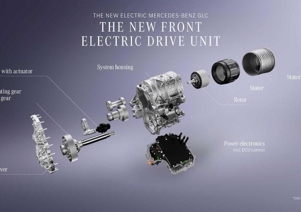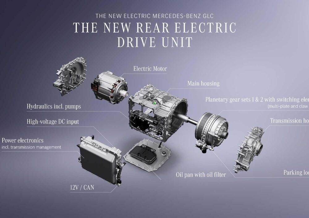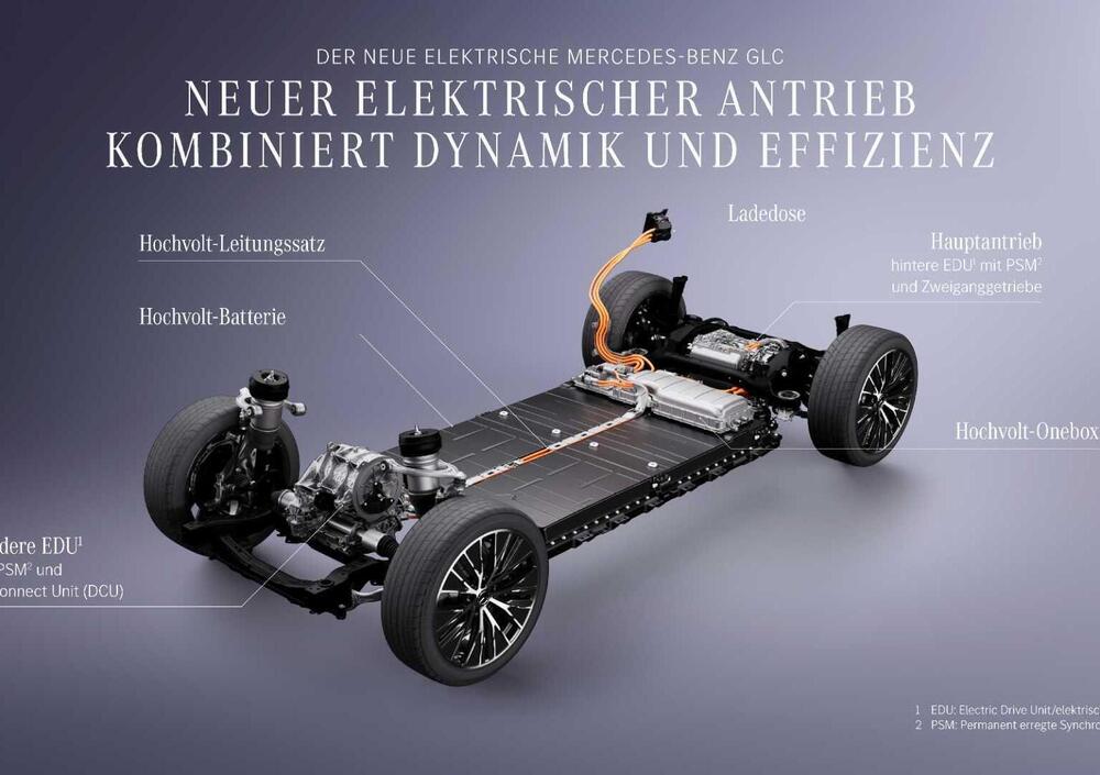 L'architettura della nuova GLC è basata su un sistema a 800 Volt, con due motori sincroni a magnete permanente (PSM/PSM) per la versione AWD. Il sistema di trazione posteriore adotta un cambio a due rapporti sviluppato in-house: il primo rapporto (11:1) ottimizza l'accelerazione in partenza e l'efficienza nel traffico urbano e il secondo (5:1) è calibrato per le alte velocità e i percorsi autostradali (il rendimento batteria-ruota dichiarato su lunghe distanze è del 93%). Inoltre, il motore elettrico anteriore, è equipaggiato da un'unità di disinnesto (DCU) che gestisce l'inserimento e il disinserimento quasi istantaneo della trazione anteriore.