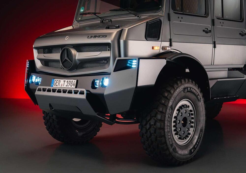 L'estetica esterna non è da meno: la carrozzeria grigio opaco, i cerchi in alluminio beadlock e un concept illuminotecnico con fari LED moderni regalano a questo Unimog un aspetto che strizza l'occhio ai SUV di lusso più desiderati, pur mantenendo quella presenza scenica imponente e inconfondibile che solo questo mezzo sa offrire.