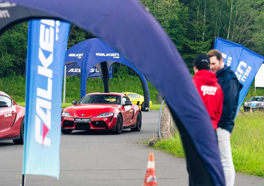 In un certo senso è anche fisiologico che un marchio come Falken abbia scelto di puntare ancora più in alto con un prodotto specifico per supercar. Da anni, infatti, questo brand si sta facendo largo sul mercato - la sua quota in Europa è più che raddoppiata in meno di dieci anni - al punto che sempre più costruttori di alta gamma scelgono proprio le gomme Falken in primo equipaggiamento. Negli ultimi anni le abbiamo trovate, per esempio su VW Passat, Porsche Macan, Audi A3 e Q3, oltre che su Mercedes-Benz Classe G e Porsche Macan. Ed è anche sempre più facile trovarle presso i gommisti: ormai sono più di 8.000 quelli che tengono i prodotti di questo brand nel Vecchio Continente, grazie a venti magazzini europei che custodiscono, pronti all’uso in ogni momento, più di 2 milioni di pneumatici. Insomma il nuovo Azenis RS820 ha le spalle larghe, perché nasce da un grande Gruppo, come punta di diamante della gamma Falken, ma solo dopo tanti anni di sviluppo e continua crescita sui mercati. Per iniziare a comprendere di che pasta è fatta questa gomma - in attesa di una vera prova strumentale - l'abbiamo provata all’interno di un centro di guida sicura nei pressi del circuito del Nürburgring. I vari test, condotti anche su superfici a scarsissima aderenza e su bagnato, sono stati condotti al volante di una Toyota Supra 3.0 da 340 CV e su una Porsche 718 Cayman GTS 4.0 da 400 CV. Gli ingegneri Falken, a margine delle prove, ci hanno spiegato come abbiano lavorato per ottenere uno pneumatico asimmetrico - una configurazione ormai adottata da tutti i prodotti U-UHP - capace di garantire, attraverso una particolare mescola e un disegno del battistrada particolarmente curato, altissimi livelli di aderenza laterale in curva e grande performance anche in presenza di bagnato, oltre a un peso complessivo inferiore a quello dei prodotti più tradizionali della gamma Falken.