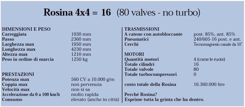 La scheda tecnica definitiva recita così: Potenza 560 Cv a 10.000 giri, coppia non pervenuta o forse non misurabile, velocità sconosciuta o comunque vincolata al coraggio di chi la guida e consumi meglio non indagarli, per un peso in ordine di marcia tutto sommato contenuto in meno di 1300 kg. Sulla carrozzeria, oltre agli sponsor che hanno contribuito alla realizzazione, campeggiano la severa Rosina con l’immancabile mattarello e i nomi, senza gruppo sanguigno perché si spera che non serva, dei 3 temerari che di tanto in tanto si mettono dietro il volante, compreso quello di Loris Reggiani. Quel che conta è che alla fine la famosa scommessa nata da una discussione da bar è stata vinta.