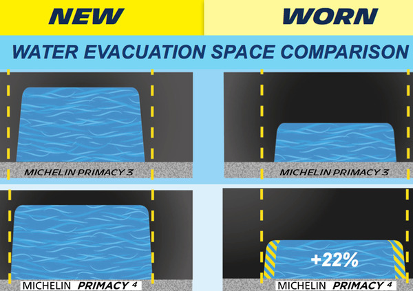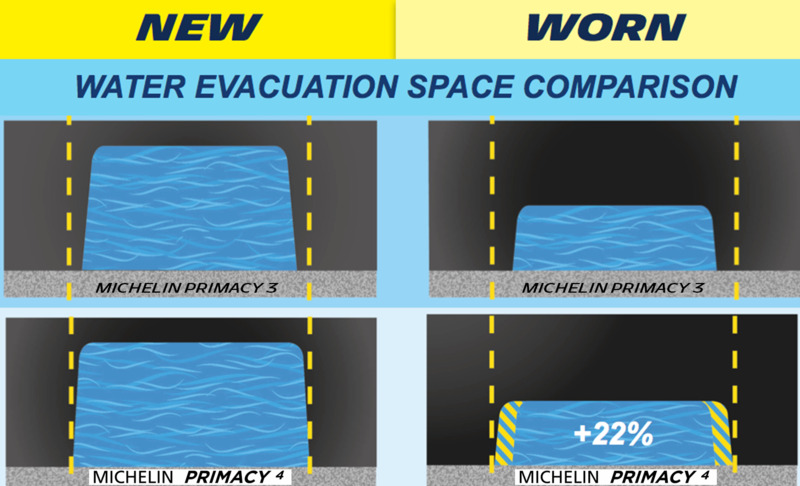Da dove arriva una prestazione di questo tipo, come quella vantata dal costruttore francese? Non certo solo dal nome e dalla storia di grande gommista. Entrando un po' più nel merito degli pneumatici moderni scopriamo come a fare la differenza, per i Primacy 4 che hanno canali più ampi al fine di migliorare la prestazione sull'acqua, ci sono ricerche e metodi costruttivi diversi per le mescole, del battistrada, lavorazioni non da tutti. Già un po' come accade in cucina di certi ristoranti stellati dove ci sono ingredienti da sempre esistenti ma utilizzati con metodi, fantasie e anche strumenti non comuni a tutte le cucine. Qualcosa di simile accade negli stabilimenti di ricerca e produttivi delle gomme francesi, che ricordiamo vengono realizzate anche in Italia. E quindi un canale più ampio non indebolisce o degrada, con una mescola più resistente (meno oli e più resine) che è però ancora ben aderente e duratura, permettendo di fare la differenza. È anche questo il delta-prezzo da pagare quando si pensa a un pneumatico Premium, quello del rendimento a lungo, a fondo del battistrada, perché ci si può anche arrivare, secondo i casi ovviamente, senza allarmismi. È in anche questo un messaggio da recepire quando si va ad acquistare pneumatico, estivo o invernale e lo conferma ai microfoni di Automoto.it il responsabile Michelin Valerio Sonvilla, con alcuni dettagli in più. Per esempio il Primacy 4 oltre alla presenza del tradizionale indicatore usura, sulla spalla, ha anche una marcatura Michelin nella parte bassa dei canali, per identificare semplicemente il livello di usura.