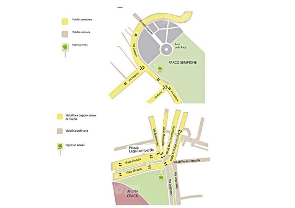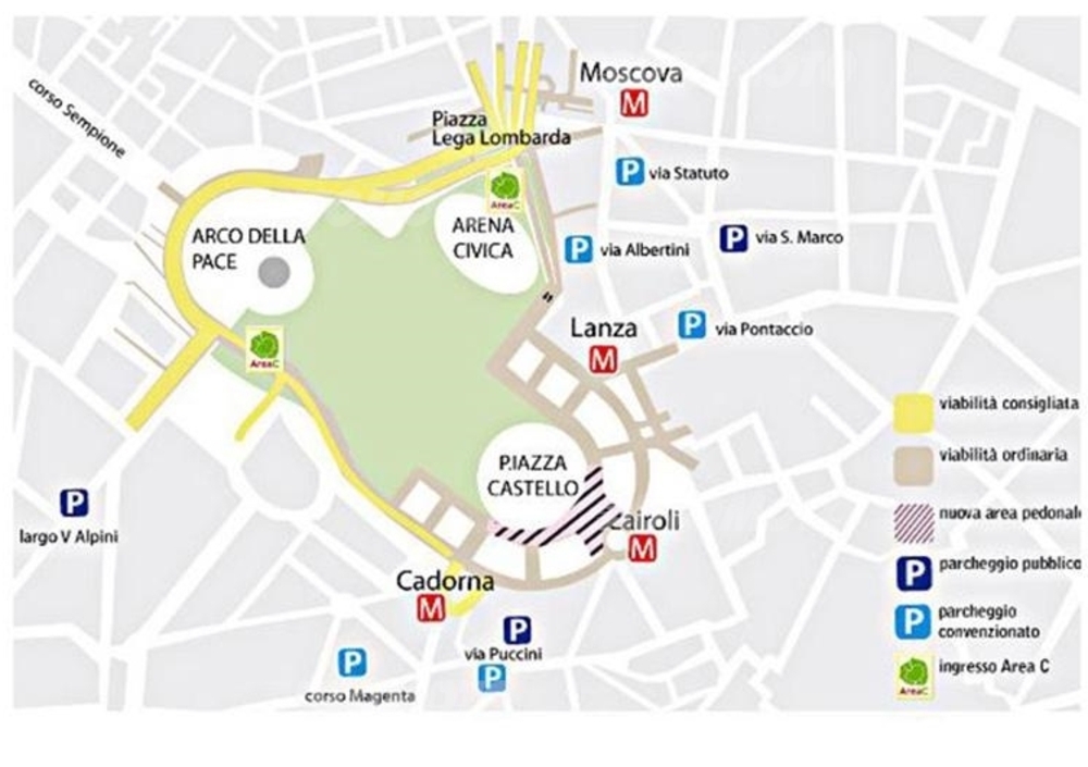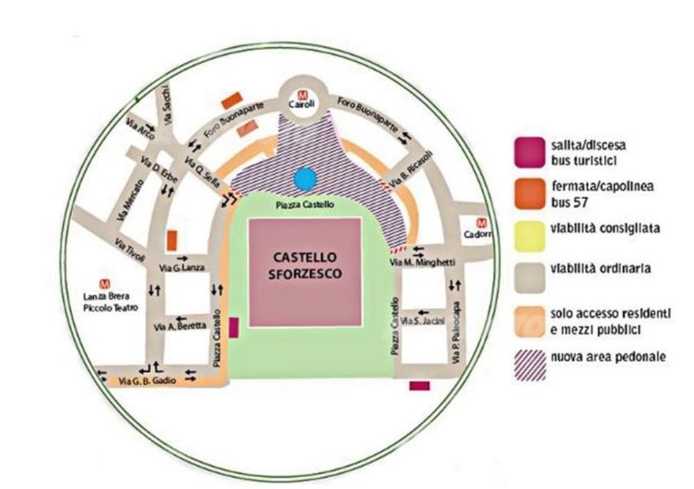 I primi interventi interessano la viabilità di via Foro Buonaparte con l’istituzione del doppio senso di marcia nel tratto compreso tra via Lanza e via Gadio. Via Lanza: sarà istituito il senso unico di marcia con viabilità da Foro Buonaparte a piazza Castello.