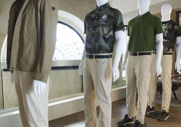 Il guardaroba maschile proposto usa design contemporaneo e altissima qualità, con i principi distintivi del marchio: informal luxury, future shaper, designer of experiences. I capi must-have hanno i codici stilistici delle supersportive emiliane che vincono nei vari Trofei: il SuperLight Trench blu in tessuto tecnico traspirante, antivento, antipioggia, ha la fodera interna, il sotto collo e la trapuntatura delle maniche dal pattern esagonale (richiamo al disegno dei sedili della Urus); il Techno Camo Blouson in nylon jacquard “camouflage Lamborghini” ha il tessuto cangiante lucido-opaco con un audace effetto 3d; l'iconica Supercar Jacket in pelle morbida nera ha i gomiti impunturati ad esagono, un vero capo per cocktail da sogno, se unito alla guida di auto che si accompagnano al medesimo marchio; la Khaki Cotton Jacket ha le impunture a vista e i dettagli di costruzione visibili che richiamano le supersportive, con fodera interna a pattern esagonale. Non mancano felpe e polo con il claim URUS #sincewemadeitpossible ricamato sulla spalla sinistra, o sul sotto collo, le t-shirt e polo in jacquard cotone Makò con esagono, i chinos in cotone color alluminio e il pantalone cinque tasche in cotone color khaki, con cuciture che riprendono la “Y” (tre Y unite formano l’esagono Lamborghini).