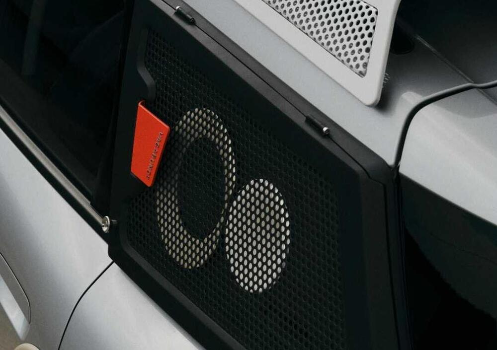 Qui la collaborazione compie il salto concettuale più ardito. I finestrini posteriori laterali sono stati rimossi e sostituiti da un sistema audio progettato specificamente per la diffusione del suono all'aperto. Al centro del progetto c'è un alloggiamento per altoparlanti realizzato in granito polimerico fuso, un materiale scelto per le sue caratteristiche di riproduzione sonora pulita e priva di distorsioni. Tweeter e mid-range sono integrati direttamente nella scocca, mentre i subwoofer posteriori esprimono la loro potenza quando si apre il portellone. Ogni vettura funziona come sistema autonomo, ma è nella coppia che il progetto svela la propria natura: un palco mobile a due postazioni capace di trasformare un parcheggio in un luogo di ritrovo.