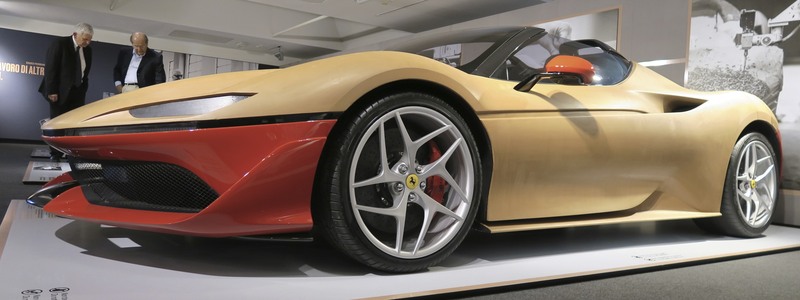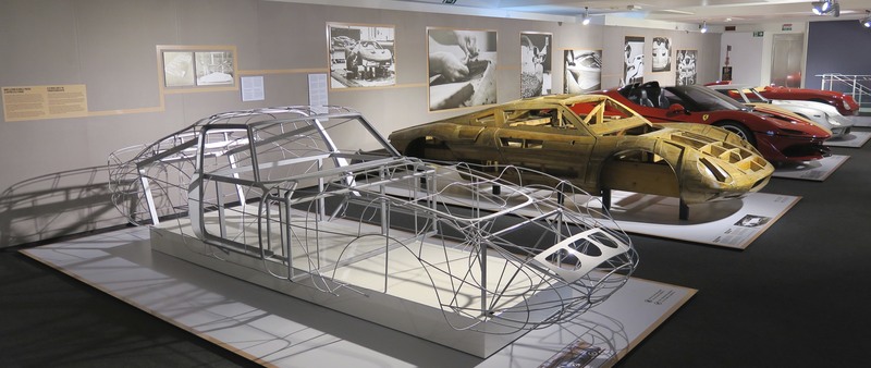 Bello vedere poi l'evoluzione dei modelli di studio, da quelli storici più artigianali e diretti a quelli contemporanei sintetici, fatti dal computer. Ibrida la J50, sgrezzata dal cam e interamente finita a mano, come illustrato dalle belle foto poste a spegazione del modello. Queste esperienze sono tra le più interessanti del museo: fanno vedere come si lavora oggi in ambito del design Ferrari. Il percorso è ben spiegato: dalla meccanica, con l'”esploso” di una 458 al grezzo, si percorre in un ordine diluito tra tecnica e storicismo l'evoluzione delle carrozzerie di studio, dagli anni d'oro ad oggi. Il “filo” della Gto e il “mascherone” su cui batterono le lastre della 365 P fanno sentire parecchio l'empatia con l'auto fatta a mano da persone tanto semplici quanto geniali. Vi è la storia dell'uomo che viveva ancora in cascine povere, parlava solo dialetto ma proporzionava i volumi dei futuri miti delle quattro ruote e ribatteva le lastre di lamiera con una maestria tale da renderlo impeccabile, sobrio e impareggiabile. Diverso è il feeling con J50: è giustamente inserita tra i pezzi forti della storia Ferrari ed il suo lessico è diverso. E' intriso di un rapporto con la velocità totalmente differente rispetto alla Gto, che doveva vincere assolutamente in gara. La prestazione di J50 è effimera ed il suo linguaggio più specializzato rispetto alle progenitrici. Ma qui comprendiamo che i ragionamenti che l'hanno generata sono fatti da uomini, come una volta, la cui bravura per fortuna rimane sempre leggibile. Senza questo racconto museale non comprendiamo al meglio l'attualità, non ci rendiamo conto se il nostro periodo storico sia felice o represso e che messaggi ci stia portando.