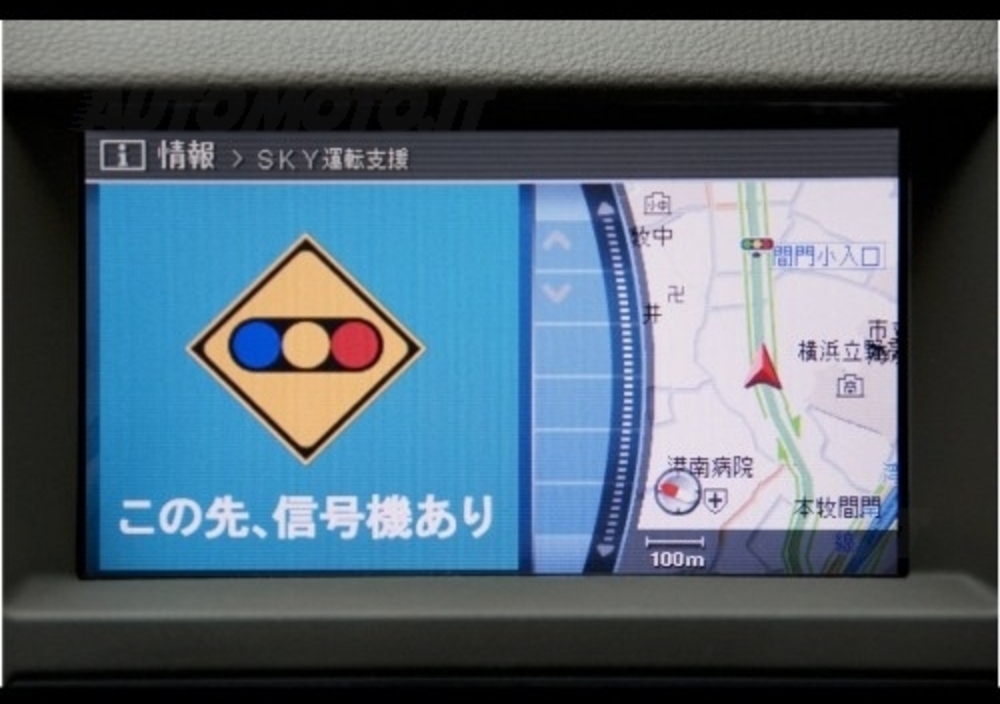 Agli incroci, specie quando la visibilità non è ottimale, il sistema avverte il guidatore del rapido avvicinamento di altri veicoli. Se, ad esempio, rileva la presenza di un veicolo in arrivo da sinistra a velocità sostenuta, attiva un cicalino e un messaggio preregistrato del tipo: “Auto in avvicinamento da sinistra”. Contemporaneamente, sullo schermo del navigatore CARWINGS, appare l’immagine di un veicolo in avvicinamento. Il sistema avverte inoltre l’automobilista se questi si sta avvicinando a velocità troppo elevata a uno stop o a un semaforo rosso.