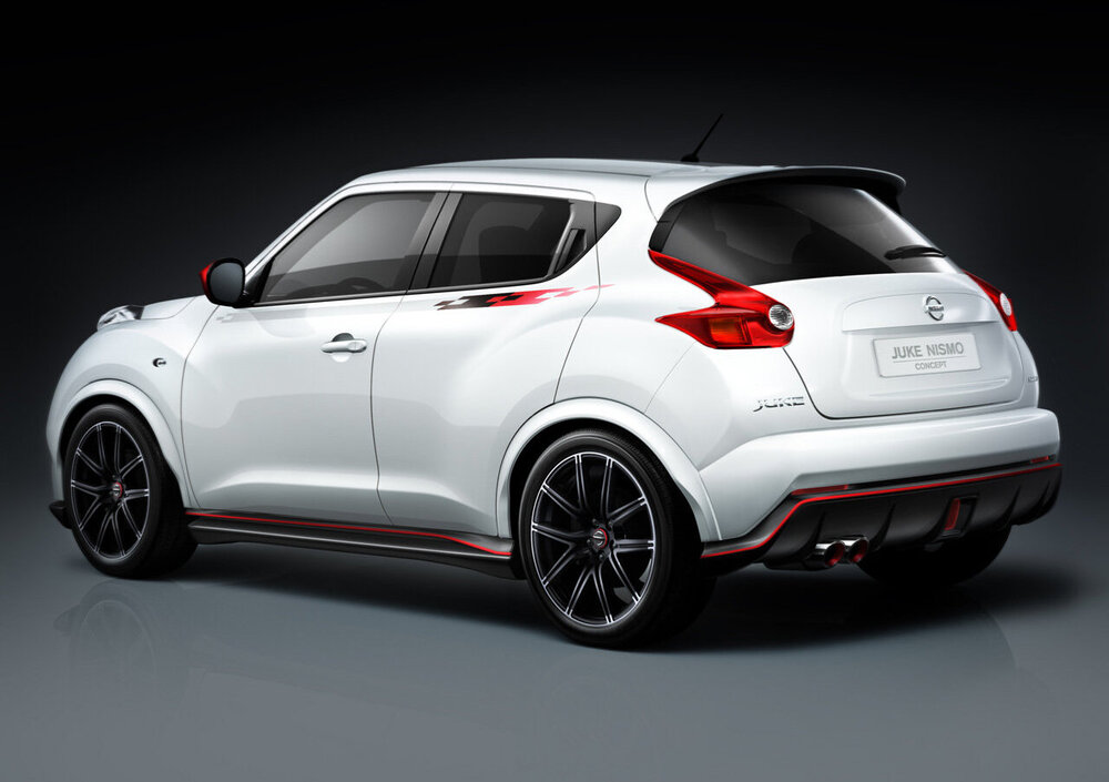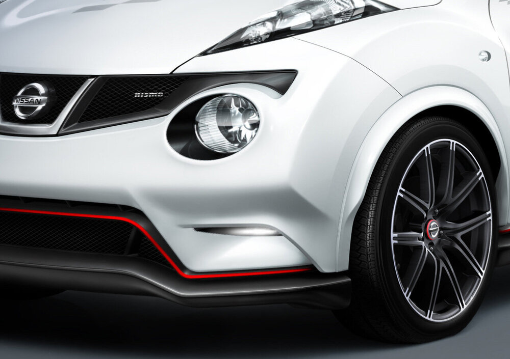 Caratterizzato dalla tipica livrea della divisione sportiva (bianco perla con dettagli rossi), il Juke Nismo è equipaggiato con paraurti anteriori e posteriori ridefiniti in posizione ribassata, parafanghi più larghi e minigonne sottoporta, oltre che con pneumatici più larghi e cerchi in lega da 19".