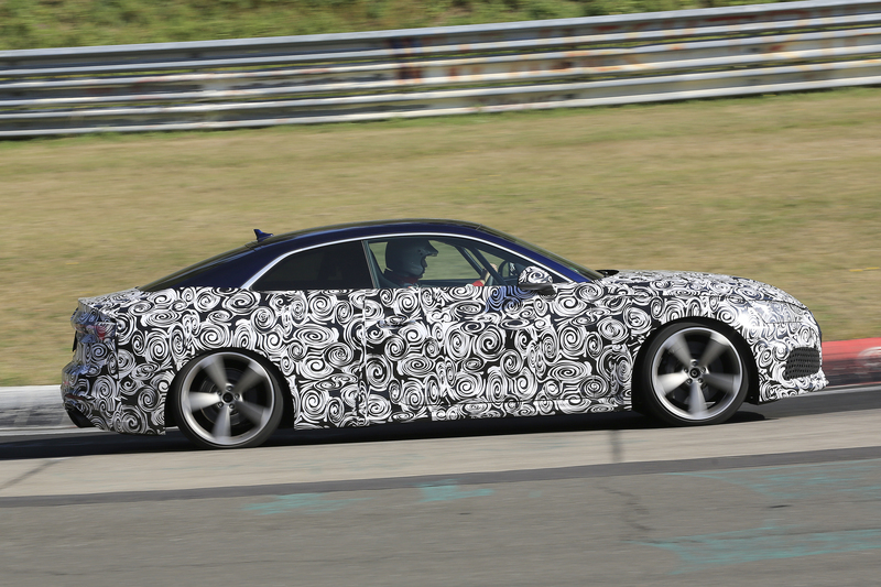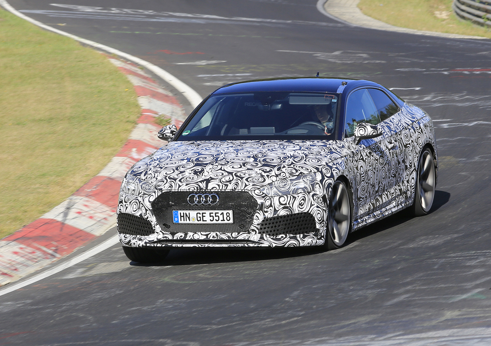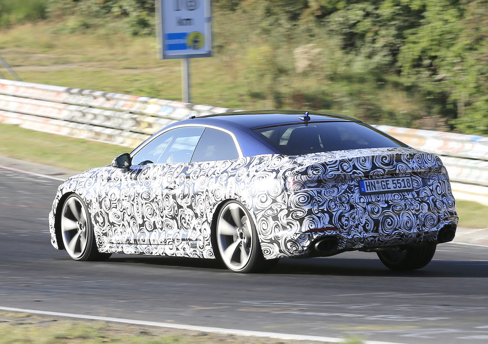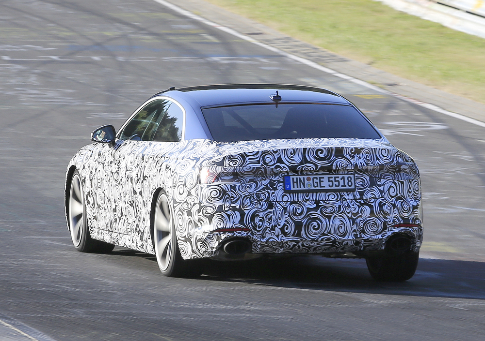 In arrivo probabilmente a Detroit a gennaio o a Ginevra a marzo, la nuova Audi RS5 prosegue i test di collaudo e sviluppo sul leggendario tracciato del Nürburgring. Dopo essere stata fotografata a maggio, ora si ripresenta all'obiettivo dei nostri fotografi "mascherata" da importanti camuffature.